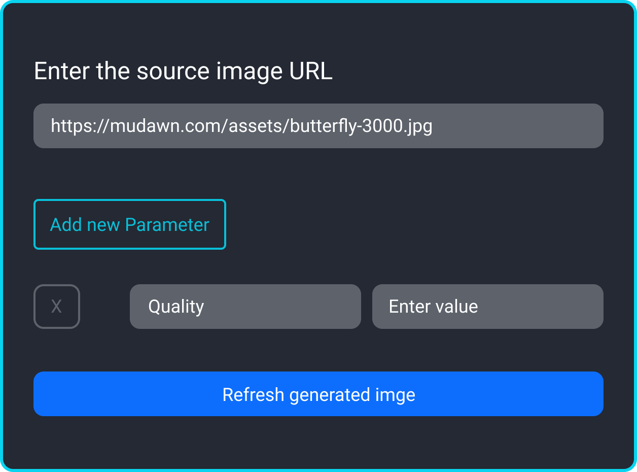 Easily upload an image from your device or use a direct URL to fetch an image from any online source. No need for manual downloads—Flyimg does it for you instantly.